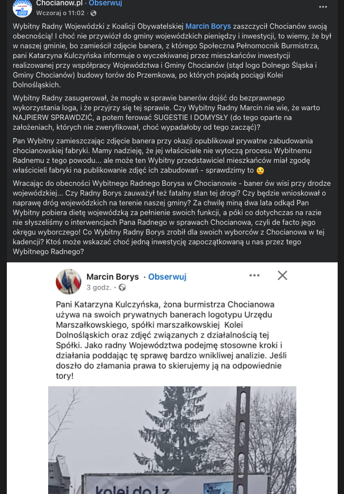 W odpowiedzi ze strony środowiska związanego z Chocianowem nie pojawia się jednak informacja o zgodach, podstawach prawnych ani charakterze kampanii. Zamiast tego rozmowa zaczyna przesuwać się w inną stronę: pojawiają się ironiczne komentarze, próby podważania intencji pytającego, dygresje dotyczące zupełnie innych tematów.