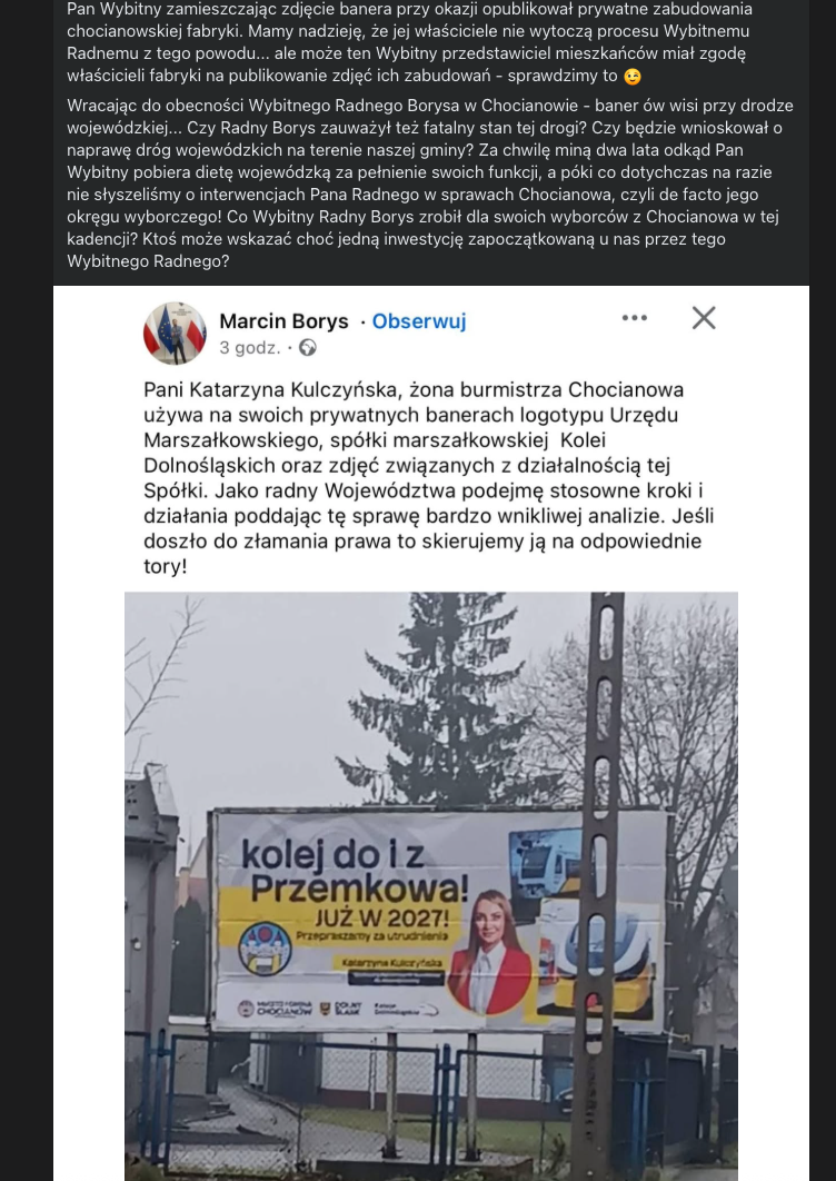 Po publikacji zdjęcia billboardu głos zabrał Marcin Borys, zapowiadając analizę sprawy i ewentualne dalsze kroki. Sam wpis radnego opiera się na fakcie, który nie został zakwestionowany – użyciu logotypów i materiałów związanych z działalnością instytucji publicznych na prywatnym bannerze.