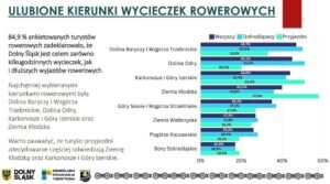 Warto jednak zauważyć, że Dolnośląskie to nie tylko obszary górskie. Badani turyści rowerowi wskazali Dolinę Baryczy i Wzgórza Trzebnickie, Dolinę Odry (obejmującą okolice Wrocławia, Legnicy, Lubina, czy Oławy) oraz Karkonosze i Góry Izerskie jako najchętniej wybierane kierunki rowerowe.