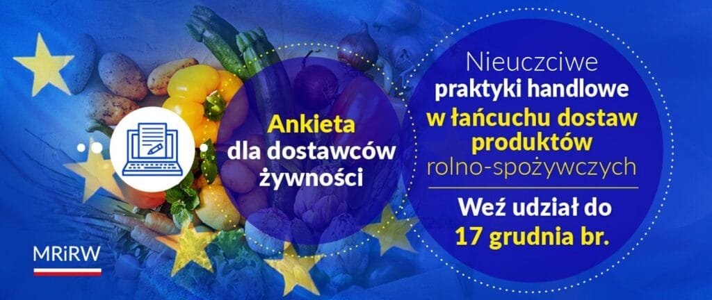 Zapraszamy dostawców produktów rolnych i spożywczych do wzięcia udziału w badaniu Komisji Europejskiej (KE) dotyczącym nieuczciwych praktyk handlowych w łańcuchu dostaw produktów rolnych i spożywczych. Ankieta będzie aktywna do 17 grudnia 2024 r.