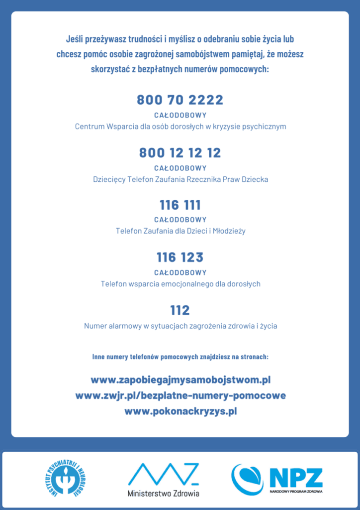 Każdy z nas może potrzebować wsparcia w trudnych chwilach. Jeśli masz myśli samobójcze, nie wahaj się skorzystać z pomocy specjalistów. Możesz zadzwonić na bezpłatną i anonimową infolinię Centrum Wsparcia dla Osób w Stanie Kryzysu Psychicznego pod numerem 800 70 2222 lub odwiedzić stronę www.liniawsparcia.pl, gdzie znajdziesz listę placówek oferujących profesjonalną pomoc.