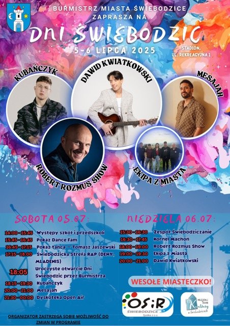 Niedziela z kolei będzie nieco bardziej rodzinna i lokalna. Na scenie wystąpi m.in. zespół Świebodziczanie, utalentowany Kornel Machoń, showman Robert Rozmus, a także zgrana „Ekipa z Miasta”. Gwiazdą wieczoru będzie Dawid Kwiatkowski, którego występy to zawsze gwarancja pełnych emocji spotkań z fanami.