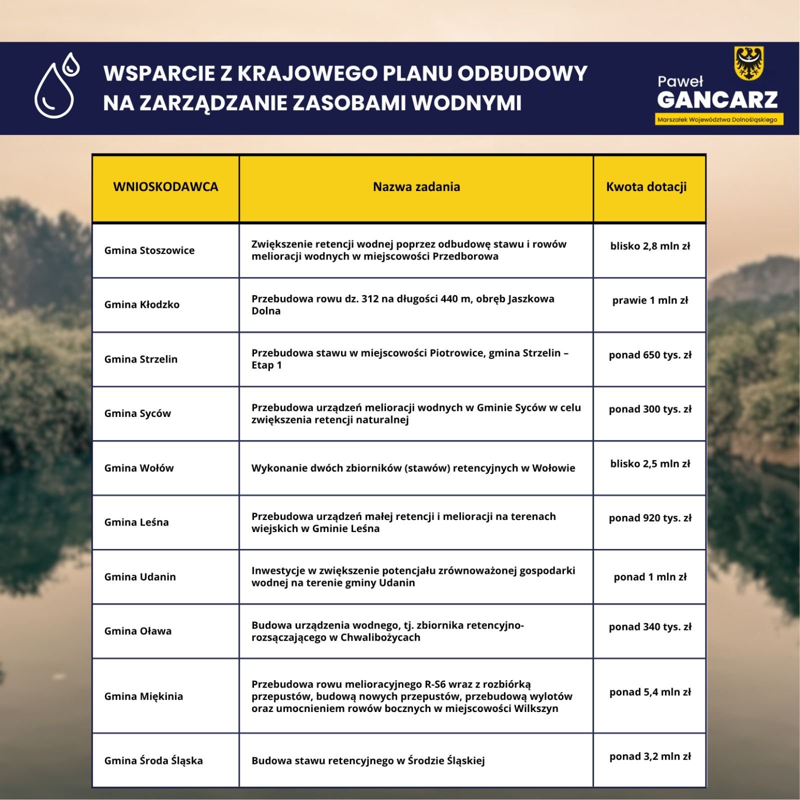 Z opublikowanej przez marszałka województwa Pawła Gancarza listy beneficjentów KPO jasno wynika, że wiele gmin z Dolnego Śląska skutecznie sięgnęło po pieniądze na meliorację, zbiorniki retencyjne i ochronę przed suszą. Dla przykładu:
