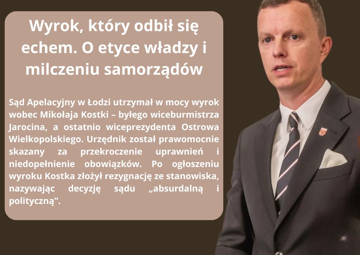 Czy władza lokalna ma jeszcze sumienie? Sprawa Mikołaja Kostki – byłego wiceburmistrza Jarocina i wiceprezydenta Ostrowa Wielkopolskiego – pokazuje coś więcej niż osobistą porażkę samorządowca. To echo systemu, w którym lojalność bywa cenniejsza niż prawo, a strach – skuteczniejszy niż kodeks etyki.